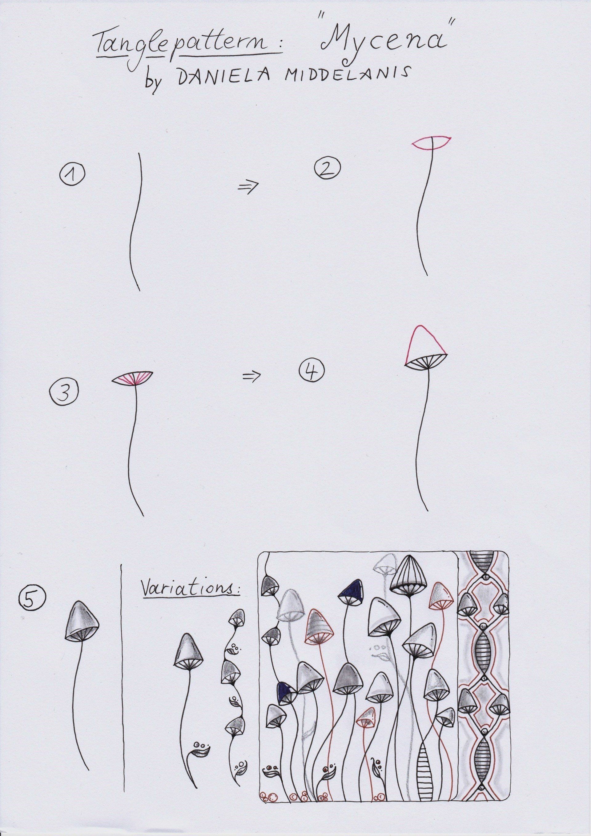 In einer Mycena-Variante, zeichnet man kleine zarte Blätter an den Stängel, dadurch kann das Tangle auch floral wirken.